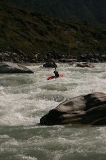The next afternoon at 2pm we were off. It was a seven hour drive to Karanprayag and when we arrived the Pindar river looked like it had a nice flow. After some rum, a dinner of roasted murga(chicken), dal chapati and bhat and a good sleep, we were off to the put in a few kms above Thrali. The whole run is roadside and approx 50kms long of grade 3-4 continuous rapids.